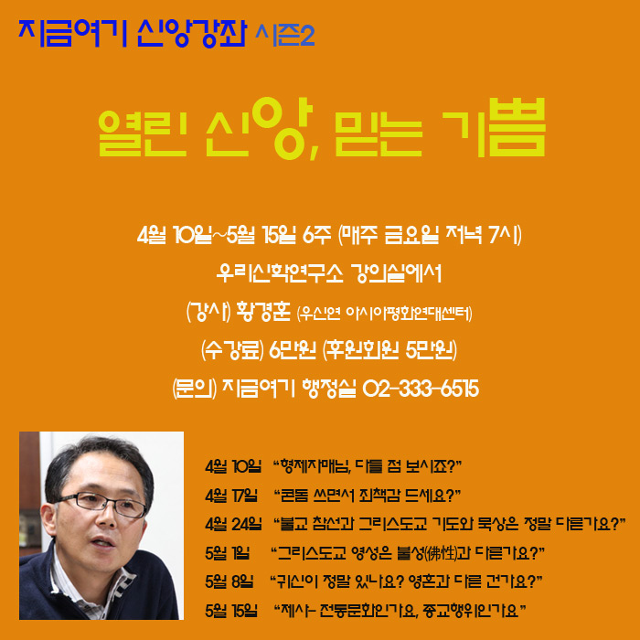 강의를 맡아주실 황경훈 박사는 우리신학연구소 아시아평화연대센터 활동을 통해 아시아 종교와 영성의 깊은 샘을 맛보신 분이고, 종교다원주의 사회를 사는 한국교회의 그리스도인들에 대한 깊은 고민을 계속해 왔습니다. 이번 기회에 관념적인 교리를 넘어 ‘생생한 신앙’을 얻어 누리시길 바랍니다.