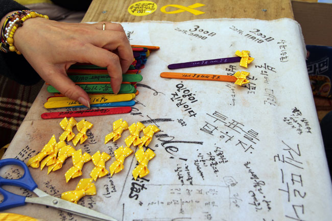 천막에 노란색만 있다가 다른 색깔이 등장하니까 신기한 모양이더군요. 오라고, 준다고, 공짜라고. 얼마냐 해서, 돈 안 받는다고 하면서 계속 준 거예요. 그래서 두 가지가 되었어요. 리본을 만들어 달아주고, 책갈피도 주면서 “책에 꽂고 세월호 잊지 마세요. 우리 잊으면 큰일 나요.” 이렇게 되었어요. 우리 가톨릭 천막에서 어느 수녀님과 후배가 털실로 팔찌를 만드는 걸 보고, 리본 실로 팔찌를 만들고 거기에 리본공작소에서 만든 리본을 끼우기로 했어요. 그랬더니 그것은 젊은 사람들이 너무 좋아하더군요. 리나 씨가 올해는 많이 감는 게 유행이라 해서, 실을 길게 해 다섯 번쯤 팔목에 감아줘요. 커플끼리 천막에 찾아오는 경우가 있어서 “이거 풀지 못하는 건데 하겠냐?”고 묻죠. 그러면 남자애랑 이렇게 보고 있다가 ‘풀지 마’ 하고 서로 약속하는 팔찌가 되었어요.