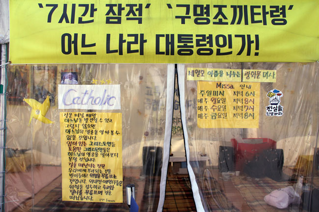 명동성당에서는 미사만 드렸는데, 여기서는 행동하죠. 그런데 예수님은 행동하는 예수였어요. 지금 천막에 붙여 놓은 글이 있는데, 예언자들은 거리에 있었지 어느 공간 안에 있지 않았다는 글이죠. 예언자들은 남들의 질시와 수고로움을 온몸으로 체험했다는 거죠. 굉장히 좋더라고요. 그리스도인이라면 그렇게 해야 한다는 거죠. 제가 성서백주간을 하는데, 묵상시간에 욕을 먹더라도 꼭 세월호 이야기를 해요. 반응이 없어도 꿋꿋하게. 그리고 상지종 신부님 매일 묵상글이 올라오면 마지막에 꼭 읽어줘요. 굉장히 긴데 욕을 먹든 말든 그냥 읽어요, 하나도 빠짐없이. 그러면서 무언의 이야기를 하죠. 성당 안에서 봉사하는 것보다 길거리로 나가면 더 좋다고.