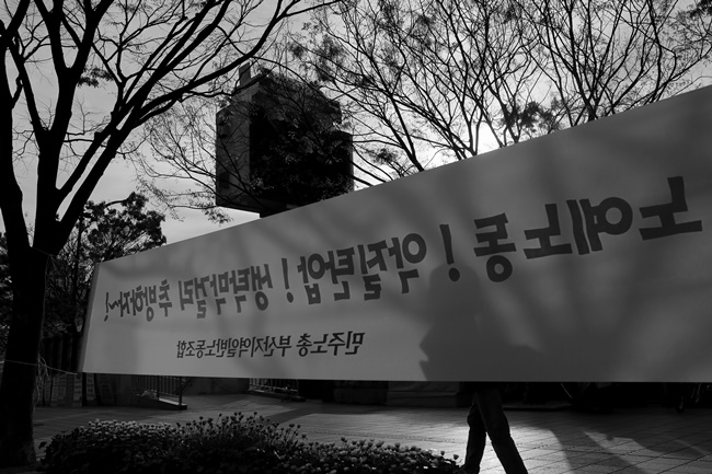 부산시청 앞의 광고탑 위로 올라가 있는 노동자들을 바라봅니다. 노동자들의 최소한의 권리인 “인간답게 살고 싶다”라는 간절한 소망이 묵살 당하는 현실 앞에 생탁을 만드는 노동자들과 택시노동자들이 있습니다.