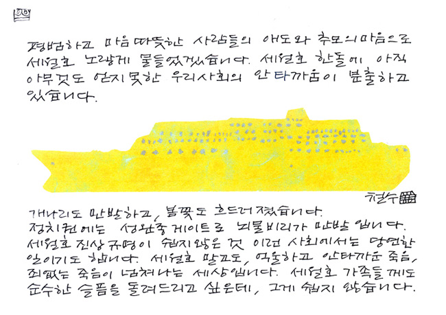 “우리는 누구나 희생자 가족들이 빠져 있는 상황과 비슷한 경험을 살면서 했을 것이라고 생각해요. 더구나 우리 부모세대, 또 그 이후 모두 역사적으로 사회적으로 트라우마가 굉장히 컸던 사회가 아닙니까? 한국전쟁과 민주화 투쟁을 겪으면서 집집마다 폭력에 희생된 구성원이 하나씩은 있던 그런 사회이지요. 다만 이번에는 어떤 의지나 사상의 대립이 빚어낸 자발적이고 자의적인 죽음이 아니라 무고한 사람들이 사고로 희생되었으니 더 억울하고 안타까운 것이지요. 또 미디어의 발전으로 우리는 죽음을 생중계로 목격하게 된 사실이 더 리얼한 것이 되었어요. 사회구성원이 함께 그 트라우마를 겪을 수밖에 없는 조건이 되었으니 모두 애도하는 분위기가 될 수밖에 없어요.”
