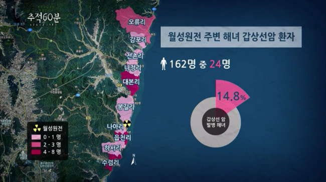 올해 3월 21일 방송된 KBS ‘추적60분’에 따르면 월성핵발전소 주변 지역 10곳(감포리, 오류리 등)의 해녀 162명 가운데 갑상선암 환자가 24명으로 발병률이 14.8퍼센트나 되는 것으로 나타났다. ‘추적60분’ 제작진은 나아리(핵발전소 반경 1킬로미터), 하서리(5킬로미터), 경주 시내(30킬로미터 이상)에서 20년 이상 산 15명의 소변 속에 방사성 물질인 삼중수소 농도를 측정했는데, 핵발전소에 가까이 살수록 삼중수소 농도는 높았다. 월성핵발전소 반경 1킬로미터에 있는 나아리 주민들에게서는 1L 당 9.93㏃, 반경 5킬로미터에 위치한 하서리 주민들에게서는 1리터 당 5.00베크렐이 검출됐고, 경주시내 주민에게서는 삼중수소가 측정이 불가능한 극미량이었다. 세포는 수분을 포함하고 있는데, 삼중수소가 세포 속의 수소를 대체하여 지속적인 피폭이 일어난다.