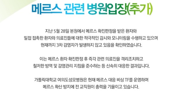 성빈센트병원 또한 홈페이지를 통해 “메르스 확진 및 2차 감염자가 없는 안전한 병원”이라고 공지하고 있으며, 부천성모병원도 “메르스 환자가 경유했지만, 외래 진료실이 아니라 야외 격리소에서 진료를 받았다”며 “안심해도 된다”고 당부했다.