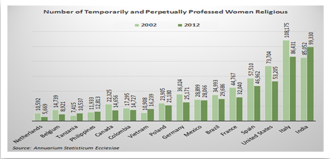 이 추이는 지난 십년 동안뿐 아니라 1960년대 중반 이후 반세기 내내 지속되었다. 남자 수도자와 교구 사제도 시차가 있긴 했지만 동일한 운명을 맞았다. 더 놀라운 점은 일단 정점에 이르고 나서부터는 큰 추세에서 반등이 일어나지 않았다는 사실이다. 이러한 선례 때문에 교세가 정점에 이르렀는지 아닌지를 중요한 기준으로 삼게 된다. 다만 신자 숫자는 지역별로 예외가 있다. 미국, 영연방 국가들 일부에서 신자 숫자는 오히려 증가하고 있기 때문이다. 이처럼 일부 예외가 있긴 하지만 종교사회학자들과 일부 신학자들은 독신을 기반으로 하는 신원들이 모두 감소한 점에 주목하여 이를 ‘독신 정결(Celibacy)의 위기’로 진단하기도 한다.