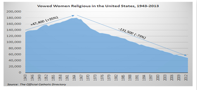 교세가 정점에 이르고 난 뒤에 나타나는 현상을 미국 여자수도회 예를 들어 설명해 본다. 미국 여자수도회는 1965년에 회원 숫자가 정점에 이른 뒤 계속 하락하여 2012년에 1965년 대비 73퍼센트 감소하였다. 하강기에도 중간 중간 일시적으로 반등이 일어난 사실을 확인할 수 있지만 대세 하락국면을 뒤집기엔 역부족이었다.(그림 2 참조)
