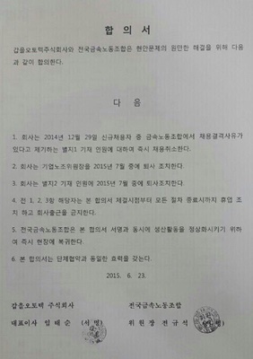 이날 서기호 의원의 대정부질의가 끝난 직후 갑을오토텍 사측과 전국금속노조 갑을오토텍지회는 폭력사태를 야기한 기업노조위원장 퇴사, 채용결격사유가 있다고 제기된 직원에 대한 채용 취소 등을 전격 합의했다.