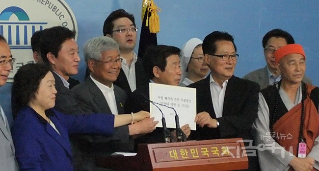 여야 국회의원 172명이 서명한 '사형 폐지에 관한 특별법안'이 7월 6일 국회에 제출됐다. 서명한 국회의원은 현재 의석 수 298명 중 57퍼센트가 넘는다. 19대 국회 들어 첫 사형폐지법안 발의다.