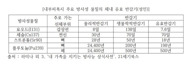 우리 몸속으로 들어온 방사능은 ‘유효(실제)반감기’가 10번 지나면 1/1000로 줄어들어서 대부분 없어진다고 할 수 있다. 이론적으로는 반감기가 아무리 많이 지나도 매우 적은 양의 방사선이 나온다고 한다. 유효반감기는 요오드131은 7.6일, 스트론튬90은 18년, 세슘137은 70일, 삼중수소는 12일, 플루토늄239는 500년이다.