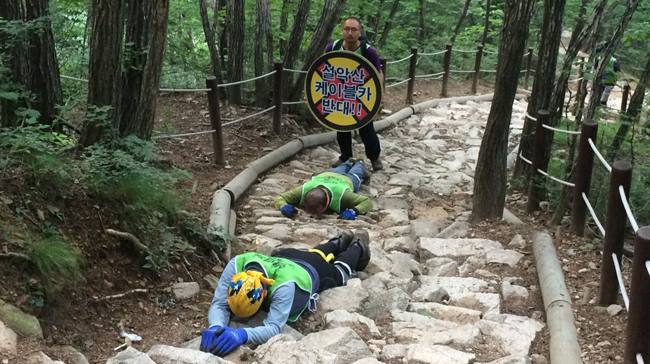 성직자와 환경운동 활동가가 설악산 오색케이블카 사업 중단을 촉구하기 위해 오체투지로 산을 올랐다.