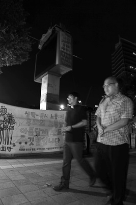 시청 앞 고공농성은 125일을 훌쩍 넘겼다. 지금도 여전히 광고탑 위의 고공 농성장에는 사람들이 있다. 마치 예수가 이승에서 마지막을 보냈을 골고타 언덕 위의 십자가처럼 고공 위의 두 사람들은 높이 매달려 있다. 사제는 바로 그곳에서 기도하며 작은 교회를 세우고 있다.