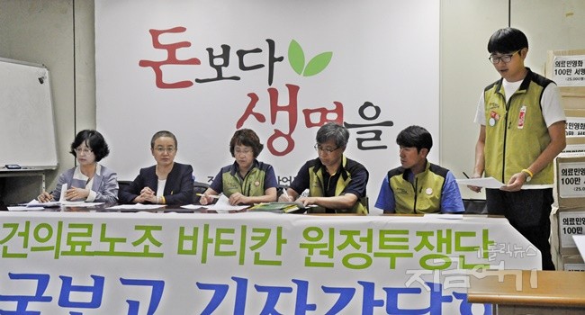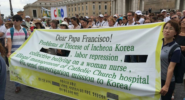 홍명옥 지부장 등 보건의료노조는 지난 5달 동안 인천성모병원의 노조탄압과 경영 문제를 해결하기 위해 1인 시위, 집회, 노숙농성, 단식 등을 벌였으나 인천교구와 병원 측은 대화에 나서지 않았다. 노조는 교황을 만나 해결하겠다며 9월 7일 바티칸 원정투쟁을 떠났고 18일 한국에 돌아와 기자회견을 열었다.