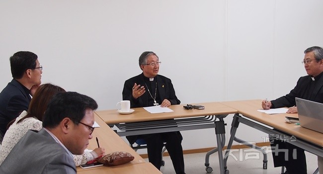 김희중 대주교는 주교회의 홍보국장 이정주 신부, 사무처장 김준철 신부와 함께 10월 15일 경기도 파주 민족화해센터에서 열린 기자간담회에서 천주교계 언론사들에 이번 총회 결과를 설명했다.