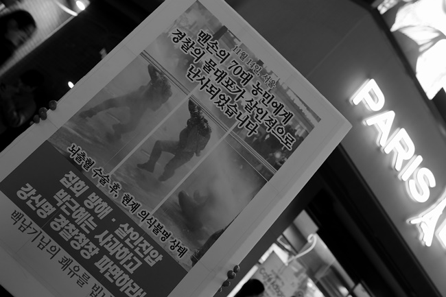 파리 테러가 일어난 다음날, 서울에서는 한 농민이 경찰의 물대포에 쓰러졌습니다. 지금 그 농민은 삶과 죽음의 경계선에서 투병 중입니다. 무장하지 않은 농민을 향한 물대포는 농민의 머리와 상체를 향했고, 농민이 피를 흘리며 쓰러진 뒤에도 직사 물대포는 쓰러진 농민을 향해 계속 발사됐습니다.