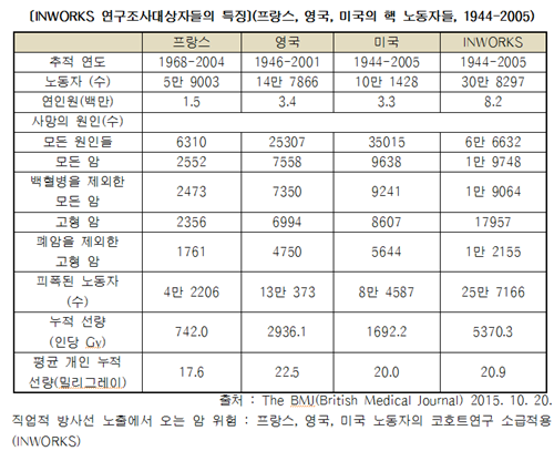 프랑스, 영국, 미국에서 1년 이상 근무한 핵산업 노동자 30만 8297명에 대하여 국제적인 추적조사를 하였는데 국제핵노동자연구(The International Nuclear WORKERS Study, INWORKS)라고 부른다. 추적조사의 대상은 프랑스의 원자력위원회, AREVA Nuclear Cycle, 국영전기회사와 미국의 에너지부와 국방부, 그리고 영국의 국립방사선근로자협회에 포함된 핵산업 회사들에 고용되었던 사람들이다. 이 집단은 822만 인년(person-years : 개개인의 추적기간(년)의 합) 동안 추적조사가 이루어졌다.