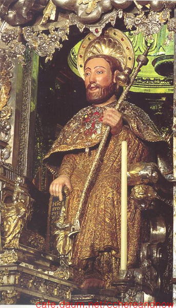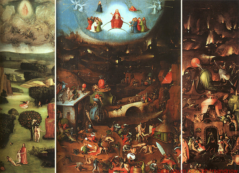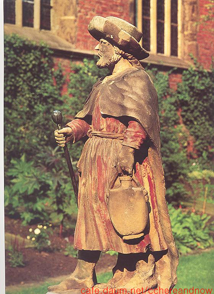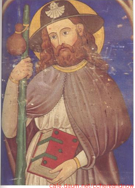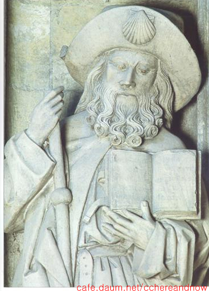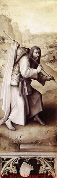 인간의 죄와 어리석음에 대한 주제에 관심을 가졌던 작가는 <최후의 날>(도9)이라는 작품의 바깥쪽 날개 왼쪽에 역시 순례자의 모습을 그려 넣었다. 그는 성 야고보이다.(도9-1) 그의 모습은 순례자의 모습으로 조각(도10,10-1)과 그림(도11)과 필사본(도12) 여러 곳에서 만날 수 있다. 성야고보가 걷고 있는 풍경은 어둡고 위협적이며 폭력이 난무한다. 이는 성야고보가 여행의 안전을 기도하는 순례자의 수호성인임을 상기시킨다. 지금도 사람들이 걷고 있는 산티아고 데 콤포스텔라에서 만날 수 있는 성인은 바로 야고보이다.(도13)