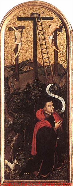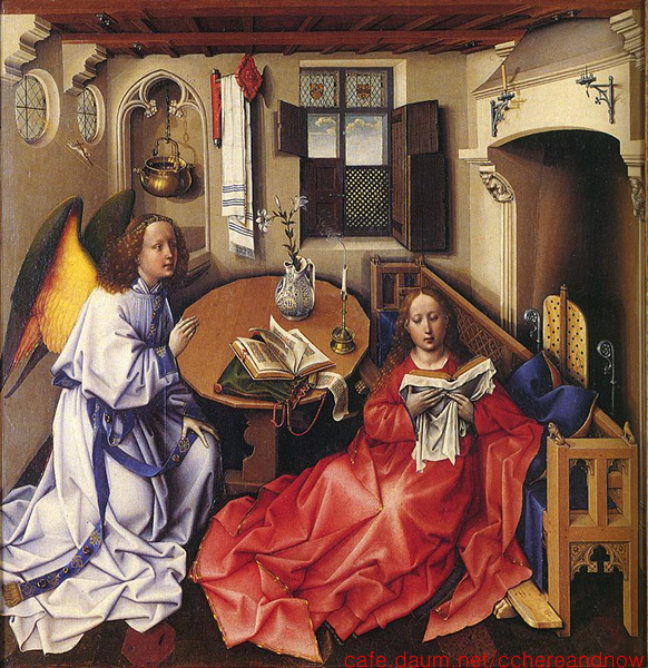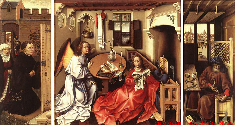 다음에 제시하는 두 그림은 바로 그러한 비전을 그림을 통해 간접적으로 경험하거나 순례를 다녀왔다는 것을 알리고 싶었던 기증자들의 염원과 일치하는 것들이다. 먼저 메로데 제단화로 알려진 그림이다. (도14)은 역시 세 폭의 제단화이다. 이 제단화의 중심 주제는 성모영보와 관련된 그림이다. 중앙패널은 우리에게 익숙한 성모영보의 장면을 보여준다. 순례와 관련한 인물이자 기증자인 사람은 왼쪽 패널에서 보인다.(도14-1) 그는 문을 열고 이 장면을 목도하고 있다. 실제 그가 이 비전을 경험했는가는 어쩌면 중요하지 않다. 이 그림은 실제장면의 고증을 위해서가 아니라 순례를 통해 이 비전을 경험했다는 것에 초점을 맞추고 있다. 그가 있는 성벽의 꽃은 장미이며 이 장미는 성모의 정원에 있는 장미이다. 그는 그의 모자에 그 장미를 꽂고 있고 그의 부인은 묵주를 들고 있다. 그들은 순례자였고 이 비전을 경험할 수 있는 곳에 갔던 것이다.