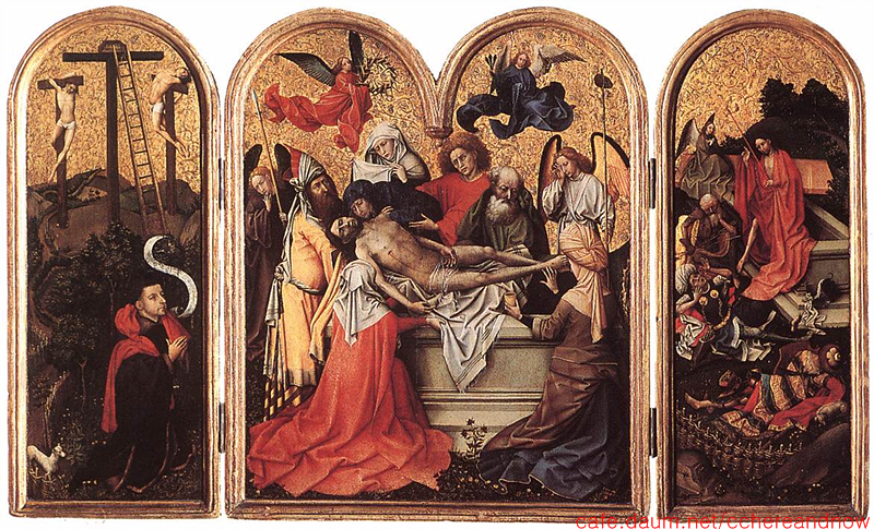 또 다른 그림(도15)은 예수의 매장이 중심 주제가 되는 그림인데 이 작품 역시 제단화이다. 제단화의 왼쪽 날개에는 먼 길을 걸어온 순례자가 있다.(도15-1) 그는 아마도 순례의 마지막 목적지에서 예수의 매장을 바라본다. 역시 이것이 실제인지 아닌지는 중요하지 않다. 십자가에서 내려진 예수를 만나기 위해 그는 예수가 걸었던 길을 걸었고 그의 뒤에 보이는 십자가가 세워진 골고타를 지나왔다. 마침내 그는 그가 만나고 싶었던 예수를 만나게 된 것이다. 제단화를 통해서 사람들은 매장되고 있는 예수를 본다. 마음으로든 실제로든 예수가 걸었던 그 길을 함께 걸으면서 예수의 고통을 함께 지고 예수의 죽음과 더불어 고통을 내려놓는다.