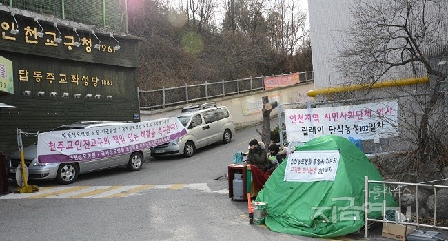 보건의료노조 인천성모병원 홍명옥 지부장과 인천지역 시민단체는 인천성모병원의 노조탄압과 국제성모병원의 의료급여 부당청구 등에 대해 인천교구 최기산 주교와 대화를 요구하며, 답동성당 들머리에서 103일째 천막농성을 하고 있다.
