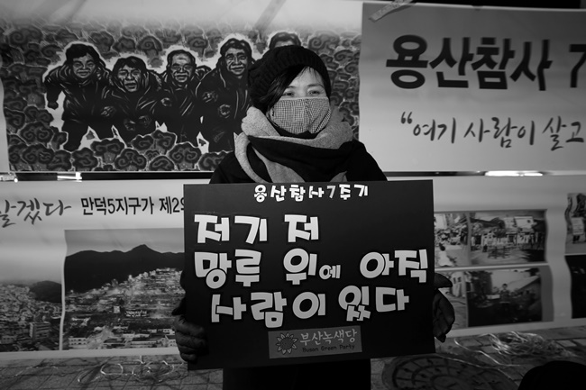 이날 저녁에는 부산 ‘LH 부산울산본부’ 앞에서 47일째 농성을 하고 있는 만덕 5지구 주민들이 용산참사 7주년을 맞아 주거생존권의 보장을 요구하며 집회를 가졌다. 만덕 5지구 사람들은 박정희 정권 때, 도심정비사업으로 영도 청학동과 수정동 산복도로 등지에서 만덕 5지구로 강제 이주된 사람들이 마을공동체를 이루며 살아오고 있는 마을이었다.