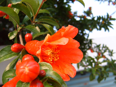 빨갛게 익어가는 석류 곁의 석류꽃과 눈이 마주쳤습니다