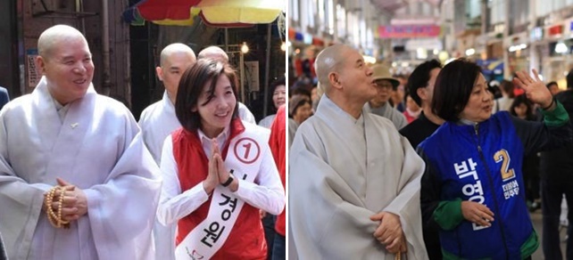 최근 조계종 자승 총무원장은 나경원, 박영선, 권영세 등 이번 총선 후보의 유세 현장을 찾아 논란이 되고 있다.