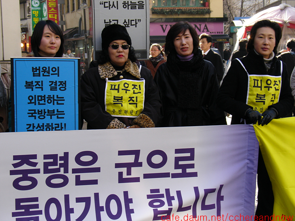 너무 추워서 함께 한 분들께 미안할 따름입니다. 하지만 마음은 따뜻합니다. 지금은 한결 마음도 편안하구요. 승소 판결이 났을 때 ‘아, 이제 복직되는 일만 남았구나’라고 생각했죠. 주변에서 국방부가 그냥 받아들이지 않을 거라고 말을 했습니다만 저는 그래도 희망을 걸었지요. 결국 국방부는 고등법원에 항소를 했고, 이제 또 싸움이 시작된 거죠. 하지만 처음에 비하면 마음도 단단해졌고. 힘이 되어주는 많은 분들이 있어 외롭지 않습니다. 처음 강제 퇴역을 당한 후 상처도 많이 받았고 복직을 위해 싸우면서 고민도 참 많이 했습니다. 군대 안에서 해결하지 못했기 때문에 부당함과 싸우기 위해서는 사회의 도움이 절실히 필요했습니다. 하지만 평생을 여군으로 군대 사회에 몸담고 있었기에 어디서부터 어떻게 시작해야할 지 막막하기만 했어요. 그때 만난 곳이 ‘인권실천시민연대’입니다. 굉장히 많은 힘을 얻었습니다. 편견 없이 얘기를 들어주었고, 사람을 중심으로 어떤 일이든 생각하게 해 주었어요. 결국 사회적으로 이슈화를 해냈어요. 맨 처음 <한겨레신문>에서 다뤄졌고, 각 언론 매체에 나가게 됐습니다. 그 후 다음 카페 ‘불사조’에서 자발적으로 나서서 나를 도와주었고, 지금의 캠페인도 함께 하고 있습니다.