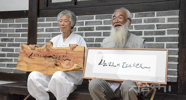 두 사람 공동 작품도 3점 있다. 백기완 소장의 붓글씨를 문정현 신부가 고스란히 나무판에 옮겼다. 문 신부는 “재밌었다. 칼이 들어갈 곳이 많았다. 세밀하게 파려니 힘이 들면서도 글귀를 생각하게 됐다”고 백 소장의 작품을 판에 새긴 소감을 말했다.