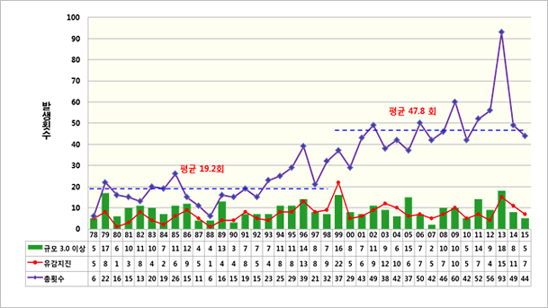 한편, 기상청 자료에 따르면, 1978년부터 1999년까지 한국에서 발생한 2.0 규모 이상 지진은 평균 약 19회였지만, 2000년대 들어 평균 약 48회로 늘었다. 2013년에는 급격히 늘어 한 해만 93회가 발생했다.