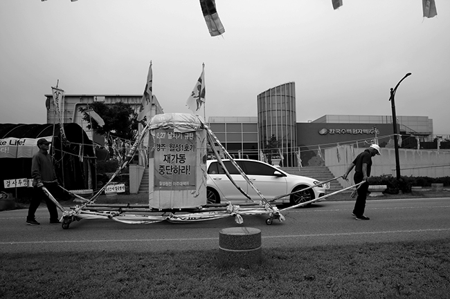 월성 핵발전소 주변 지역 주민들의 안전과 건강권을 담보하기 위해서는 핵발전소를 폐쇄 또는 가동 중인 핵발전소 수를 줄이거나 주민들을 안전한 지역으로 이주하는 것뿐입니다. 그러나 이 지역의 땅이든 집이든 매매 자체가 이루어지지 않고 있습니다. 이에 따라 월성 핵발전소 바로 곁에서 살고 있는 양남면 나아리 주민들은 2014년 8월부터 월성 한수원 앞에서 천막농성을 펼치며 이주를 요구하고 있습니다. 그러나 한수원 측은 “이주에 대한 법적 근거가 없다”는 이유로 주민들과 대화 자체를 거부하고 있습니다. 현행법은 핵발전소의 핵반응로(원자로)로부터 914미터까지 토지수용을 하도록 명시하고 있기 때문입니다.