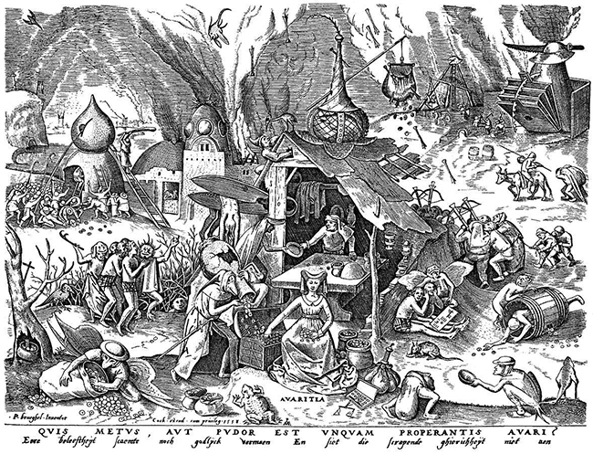 칠죄종 중 하나인 인색(avaritia)은 탐욕으로 번역하기도 하는데, 만족할 줄 모르는 재산에 대한 욕망을 의미한다. 그러나 탐욕이 주는 어감은, 남의 것을 강제로 빼앗아 가지려는 뉘앙스가 강한 편이다. 그래서인지 사람들은 자신이 탐욕과는 별로 관련이 없다고 생각한다. 하지만 원래 아바리티아(avaritia)는 적극적으로 남의 것을 탐하는 마음보다는 자신의 것을 나누지 않고 지나치게 아끼는 것, 즉 인색에 더 가까운 의미다. 실제로 가톨릭 대사전에는 아바리티아를 탐욕이 아니라 ‘간린(慳吝)’으로 번역하고 있는데, 이 ‘간린’이란 ‘아니꼬울 만큼 몹시 인색하다’는 의미다.(국립국어원 표준국어대사전) 즉 남의 것만 탐하지 않으면 되는 것이 아니라, 너무 아끼는 것 자체도 죄악이라는 것이다.