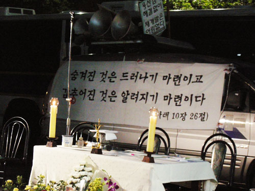 | 강론 (정석현 신부님) 이렇게 매일 찬바닥에 앉아 미사를 봉헌하고 기도를 하는 것은지도자들이 양들의 목소리를 듣지 않기 때문입니다. 무리한 요구도 아니고, 못 할 말도 아닌데 듣지 않습니다. 우리의 목소리를 들어달라고 연대하고, 투쟁도 하며, 미사를 봉헌합니다. 서로 목소리를 알아들을 수 있는 사람들끼리 모여 계속해서 요구를 하고 있습니다. 저들은 왜 듣지 않을까요... 왜 들으려 하지 않을까 정말 궁금했습니다. 그건 돈으로 무장했지만, 그것 때문에 위축된, 그래서 고립되어버린 자신들의 참모습을 들키고 싶지 않기 때문입니다. 하느님이 만드신 모든 거룩한 사람들과 함께 하라고 가르치신 사도 바오로의 말씀을 상기합시다. 윗동네에 있는 부유한 사람들이 들을 수 있게 아랫동네에 사는 가난한 우리들이 더 큰 소리를 내어야 합니다. 들을 때까지 계속해서 목소리를 내어봅시다. (진달래님 정리) |