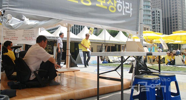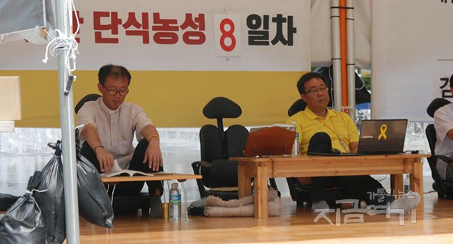 8월 24일 정오 무렵 나 신부는 광화문광장 이순신 장군상 앞에 세워진 단식 천막 안에서 책을 읽고 있었다.