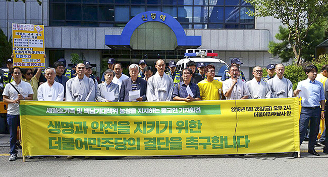 원불교, 불교, 개신교, 천주교 4대 종단 종교인들은 26일 더민주 당사 앞에서 기자회견을 열고 세월호참사와 백남기 사태 진상규명은 거래의 대상이 될 수 없고, 미룰 수 없다고 강조했다.
