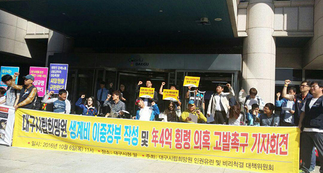 대구희망원 대책위는 “익명의 투서와 급식비 이중장부를 입수했고 지난 2012년 2월부터 11월까지 10개월간 3억 1500만 원의 주부식비를 단가와 수량 조작, 대량허위 청구 등으로 횡령했다는 증거가 나왔다”고 밝혔다.
