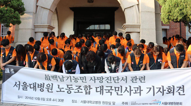 서울대병원 노조가 백남기 씨 사망진단서와 관련해 대국민사과문을 발표하고, 병원장에 유족에게 사과하고 사망진단서를 수정하라고 요구했다.