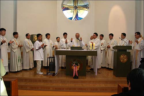 오전 9시, 은퇴미사치고는 이른 시간이다. 문 신부는 애초 은퇴미사를 하지 않고 조용히 떠나려고 했다. 그러나 지인들이 미사를 드려야 한다고 했다. 이날 자매의 집 식구들과 드리는 미사에는 문 신부의 동지들과 지인들도 함께 했다. 특히 멀리 안동과 의정부에서까지 온 정의구현사제단 신부 20여 명이 자리를 같이 했다.