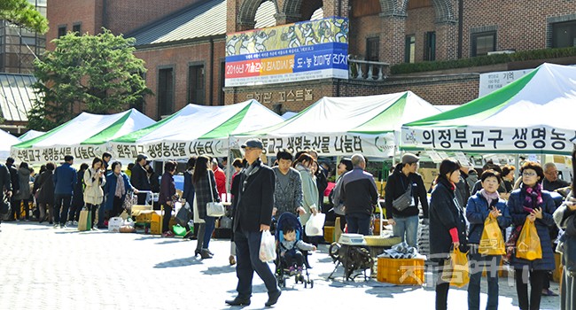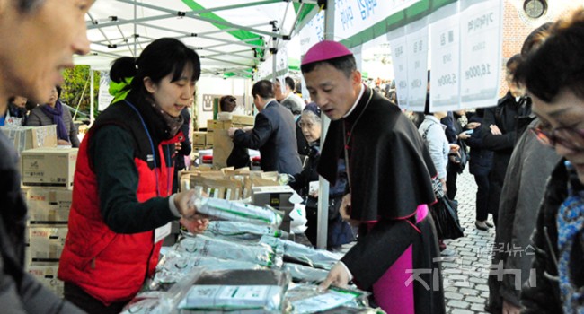 장터 구경을 나온 시민들과 우리농촌살리기운동 활동가들 그리고 꼬박 1년을 지은 결실을 내온 농민들이 섞여 왁자하다. 풍물 소리가 울리는 가운데 각 교구 본부장 사제들도 동참해 어디선가는 신선한 전어회를 썰고, 또 어디선가는 옷에 양념을 묻혀 가며 열심히 사람들을 먹일 김치를 버무린다.