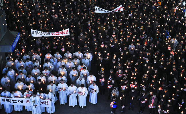 전국 곳곳에서 천주교 시국미사가 이어지고 있다. 11월 11일 저녁에는 대전, 마산교구에서 동시에 시국미사가 봉헌됐다. 대전에서는 1000명 넘는 신자가 참석한 가운데 거리 행진까지 이어졌다.