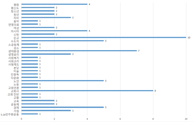 올해 천주교 토론회가 어떤 주제로 열렸는지 살펴보는 것도 지난 한 해 교회가 어떤 분야, 주제에 관심을 가졌는지 살펴보는 계기가 될 것이다. 큰 주제 별로 보면 올해 천주교가 병인순교(박해) 150주년을 기념한 만큼 ‘순교’와 관련된 토론회가 10회로 가장 많았다. 교회 곳곳에서 꾸준히 연구하고 있는 교회사 분야 토론회가 8회 열렸고, 프란치스코 교황 회칙 “찬미받으소서”와 주교회의 생태환경위원회가 신설된 흐름을 반영한 듯 생태환경 분야 토론회도 많았다.