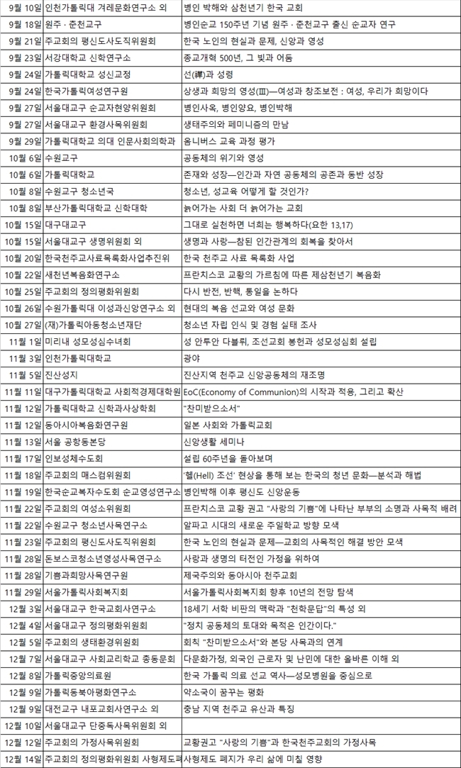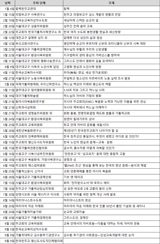 아래는 <가톨릭뉴스 지금여기>가 주교회의 홈페이지와 3개 천주교 언론사 웹사이트를 검색해 확인한 2016년 한국 천주교에서 열린 토론회 목록이다.