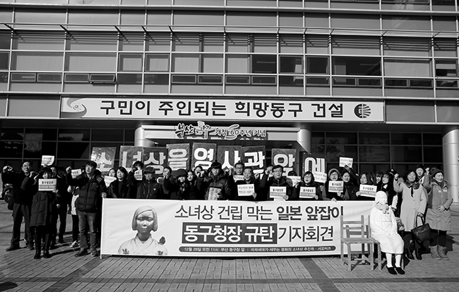평화의 소녀상은 굴욕적 위안부 합의 후 전국에서 평화의 소녀상 건립이 추진되어 시민들의 후원금으로 소녀상 건립기금을 마련하였습니다. 부산에서도 미래세대가 세우는 평화의 소녀상 서포터즈들의 활동과 시민들의 자발적 모금으로 소녀상 설치를 기다리고 있었지만, 동구청장은 동구에 있는 일본영사관 앞 소녀상 건립을 허가하지 않았습니다. 불법설치물과 도로교통 방해 등이 형식적 이유였습니다.