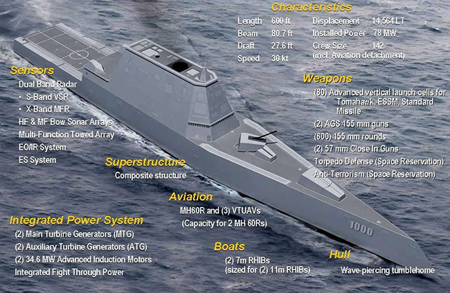 ‘줌월트’는 미군의 최신식 구축함으로 길이 약 183미터, 승조원 140명 규모다. 레이더에 거의 잡히지 않는 스텔스 기능과 함포 2문, 헬기, 드론, 미사일 발사대 등을 갖췄다. 특이한 모습으로 "우주전함"으로도 불린다.