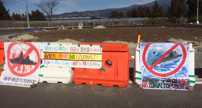 강정마을회, 제주 군사기지 저지와 평화의 섬 실현을 위한 범도민대책위 등은 2월 7일 제주해군기지 앞에서 기자회견을 열고 “줌월트급 스텔스 이지스함이 제주해군기지에 배치된다면, 제주 전체는 미군의 대 중국 전초기지가 될 것이며, 중국의 주요 타깃이 될 것”이라며, “한반도와 제주의 평화를 위협하는 줌월트 배치를 단호히 반대한다”고 밝혔다.