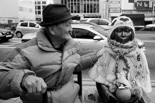 여든이 넘은 할아버지가 일본영사관 앞의 소녀상을 찾았습니다. 시력이 좋지 않은 듯 할아버지는 까만 안경을 쓰고 있었습니다. 할아버지는 소녀상을 바라보며 차마 발걸음을 떼지 못하고 있었습니다.