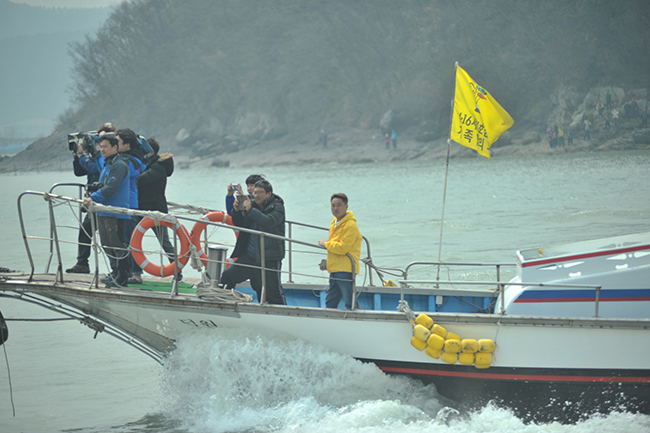 작은 낚싯배에 정의평화위원회 신부님들과 평화방송 기자분들이 함께 몸을 싣고 세월호가 있는 동거차도 앞 맹골수도로 출발했습니다. 비와 바람이 불어 배가 흔들리기는 하였지만 견딜 만한 흔들림이었습니다. 비와 바람을 헤쳐 40여 분 뒤, 세월호 선체가 보이기 시작했습니다. 이미 다른 방송국 기자들이 탄 배와 해경, 미수습자 가족분들이 탄 해양수산부 배, 그리고 세월호 유가족분들이 탄 배들이 세월호를 싣고 있는 반잠수선 화이트마린 호를 큰 원 형태로 둘러싸고 함께 움직이고 있었습니다.