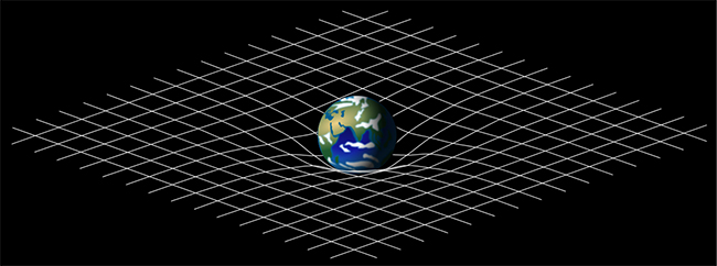 만유인력은 질량을 가진 두 물체 사이에 존재하는 힘에 관심을 가졌다. 그래서 중력을 표현하는 그림은 두 물체 사이에 끈이 이어진 듯 설명했다. 충분히 인력이 강하다면 중력에 의해 두 물체는 운동을 하게 될 것이다. 지구가 끌어당기는 낙하운동이나 태양 주위를 도는 지구의 궤도 운동을 생각하면 된다. 물체 중심의 운동이고 인력이 발생하는 이유는 물체가 질량을 가지고 있기 때문이라 설명한다. 그러나 일반 상대성 이론은 다른 방법으로 중력을 설명한다. 팽팽하게 당겨져 있는 탄력 있는 천 위에 볼링공 하나를 놓아 보자. 볼링공을 중심으로 움푹 들어간 천은 곡면을 만든다. 여기에 탁구공 하나를 천 위에 적당히 놓으면 볼링공으로 변형된 곡면을 따라서 떨어지게 된다. 중력을 이처럼 설명할 수 있다. 질량을 가진 물체가 공간에 놓이게 되면 볼링공처럼 공간을 변형시키고 변형된 공간 주변에 놓인 다른 질량은 그 변형된 공간을 따라 이동하게 된다.