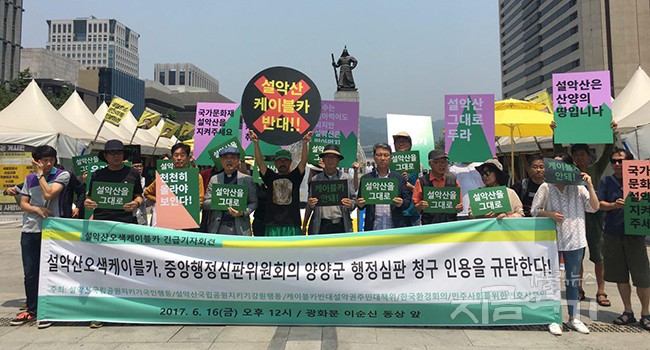 16일, 중앙행정심판위원회의 결정을 규탄하는 기자회견에 참석한 설악산국립공원지키기 국민행동, 한국환경회의, 민주사회를 위한 변호사모임 등은 설악산 오색케이블카 사업 불허는 하나의 개발사업을 막은 것이 아니라 법과 원칙, 나아가 민주주의 가치를 바로 세운 것이었다며, “그러나 박근혜 정부의 적폐청산이 최고 국정과제여야 할 문재인 정부는 중앙행정심판위원회로 하여금 박근혜 정부의 환경적폐를 용인하게 한 것”이라고 비판했다.