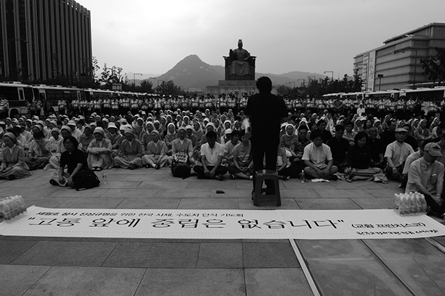 세월호 참사 후 광화문 광장에서 쉬지 않고 바쳐졌던 기도가 얼마 전 그 긴 여정을 마감했다. 광장은 그간 그 자리를 채운 이들에게 어떤 곳이었을까. 나와 같은 누군가에게는 고통에 당장 달려갈 수 없는 부채감을 덜어 준 공간이기도 했겠지만 분명 또 다른 누군가에게는 한 번도 만나 보지 못한 낯선 고통과 연결되는 자리였을 것이다. 기도로 뾰족이 달라진 것은 없지만 분명 광장은 그렇게 그 날수만큼 교회에게, 또 세상에게 보다 생생한 말과 손을 얻어 준 고마운 자리였으리라. 이제 광장이 키운 그 말들이, 그 손들이 더 많은 고통들에, 더 낯설고 후미진 상처들에 가닿으리라 짐작할 따름이다. 아픈 속살에 닿아 본 이라면, 고통에 연결되어 본 자라면 결코 그 고통을 떠날 수 없는 까닭이다.