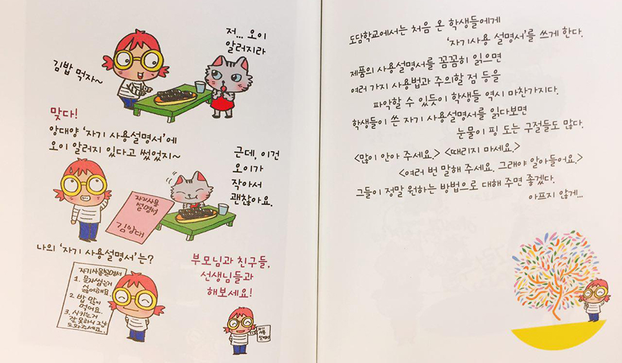 다행히 아이들은 이런 비인간적 신호에 민감해서, 뭔지 모르지만 짜증부터 나고 울음을 터뜨리거나 안절부절못한다. 자신을 기형적 체제에 순응시키거나 자기 자신으로 있기를 선택하는 기로에 놓일 때, 대부분 사람들은 알든 모르든 전자의 길로 휩쓸려간다. 하지만 삐삐쌤은 여기서 자기 자신을 잃지 않도록 “각자 ‘나’를 칭찬해 주자고!”, “사람은 다 달라. 창의적으로 꿈꾸자.”라며 아이들로 하여금 있는 그대로의 자신을 보게 하고, “좀 더 너그러워지자!”, “그럴 수도 있어.”, “소소한 즐거움을 찾아보자!” 라며 친구 간에 서로 돕기에 주력하도록, '함께하는' 지혜로 이끈다. 아이들은 자신의 악보를 그려 보고 친구들과 함께 화음 맞추기, 자기 사용설명서를 쓰고, 서로 알아가며 원하는 방법으로 잘 대해 주기, 그리고 긍정, 믿음, 희망, 사랑, 감사로 평화와 행복을 얻는 법을 배워 나간다. 책 마지막에 “졸업, 사랑이었단다.”라는 한 줄은 끝나지 않던 오르막길이 돌아보니 꽃길이었음을 보여 주는 듯하다.