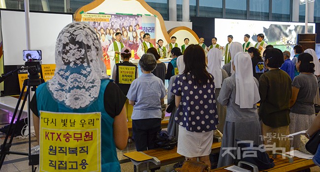 KTX 해고 승무원 문제를 위한 종단별 기도회가 열리고 있다. 그 첫 번째로 7월 10일 천주교 서울대교구 노동사목위원회가 서울역 대합실에서 ‘KTX 해고 승무원 문제 해결을 바라는 미사’를 봉헌했다. 서울대교구 유경촌 보좌주교를 비롯해 교구 사제 12명이 공동으로 미사를 집전했으며, 수도자와 평신도 등 120여 명이 함께했다.